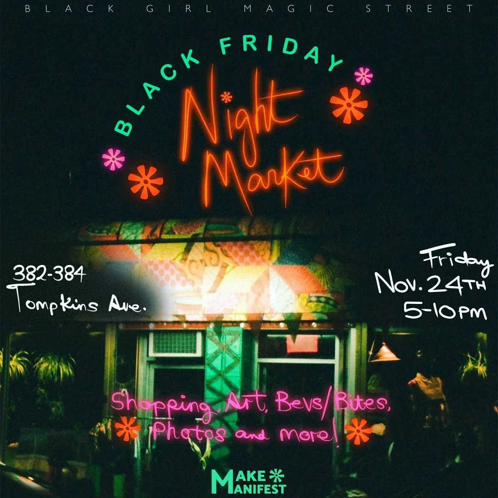 Kicking off the vibes Nov 24th with our Black Friday Night Market, on the vibrant Tompkins Ave in Bedstuy Brooklyn, affectionately known as Black Girl Magic Street. We will commence our Annual Winter Artisan Market season, with a curated line-up of black-owned brands, live music, Art, DJ sets, and much more. This year's Marketplace will transform our slice of Tompkins Ave into a festive, indoor/outdoor “winter village” certain to bring the holiday spirit to Black Girl Magic Street!