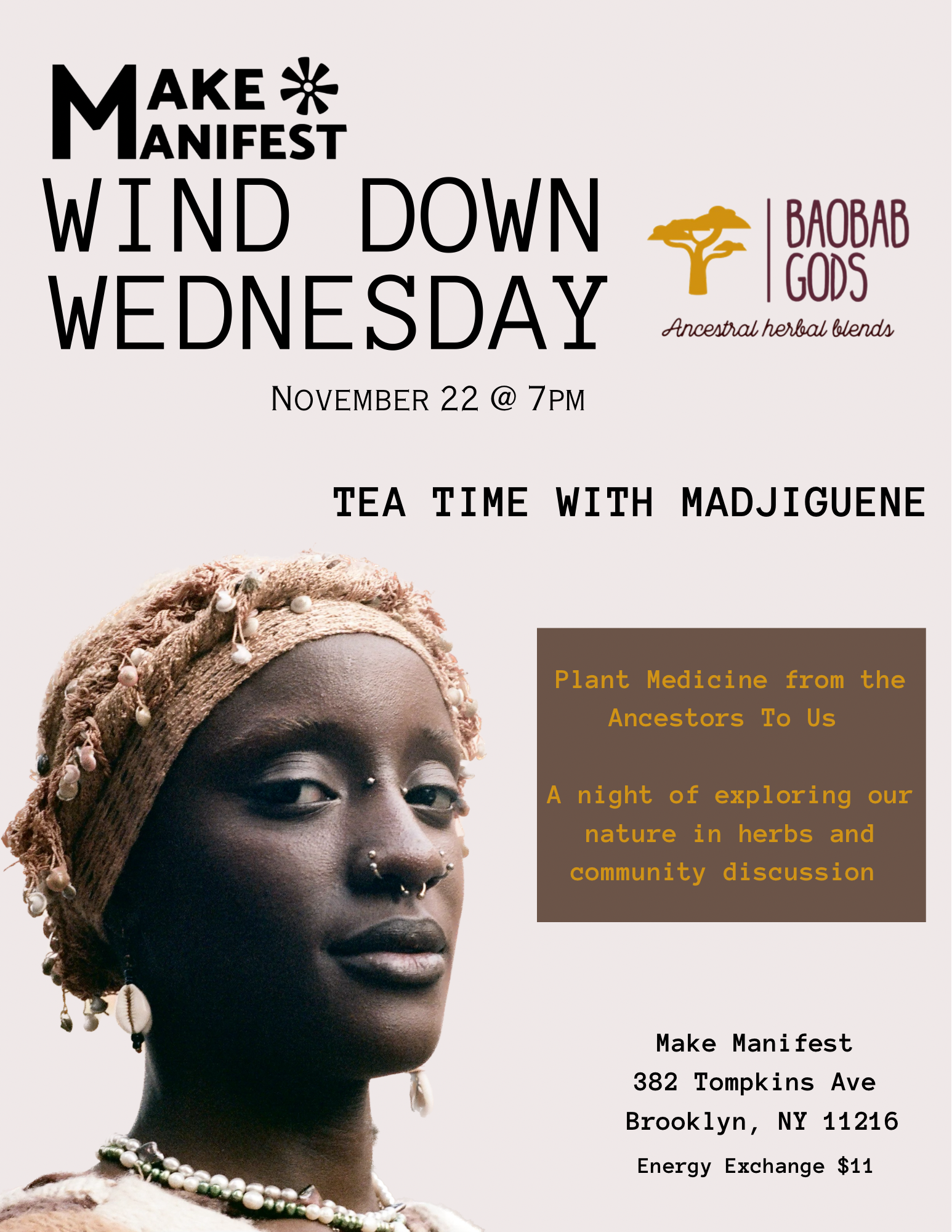 Join us for a relaxing Wind Down Wednesday special Tea Time with Madjiguene session! This in-person event will take place on Wednesday, November 22, 2023 at 7:00 PM.