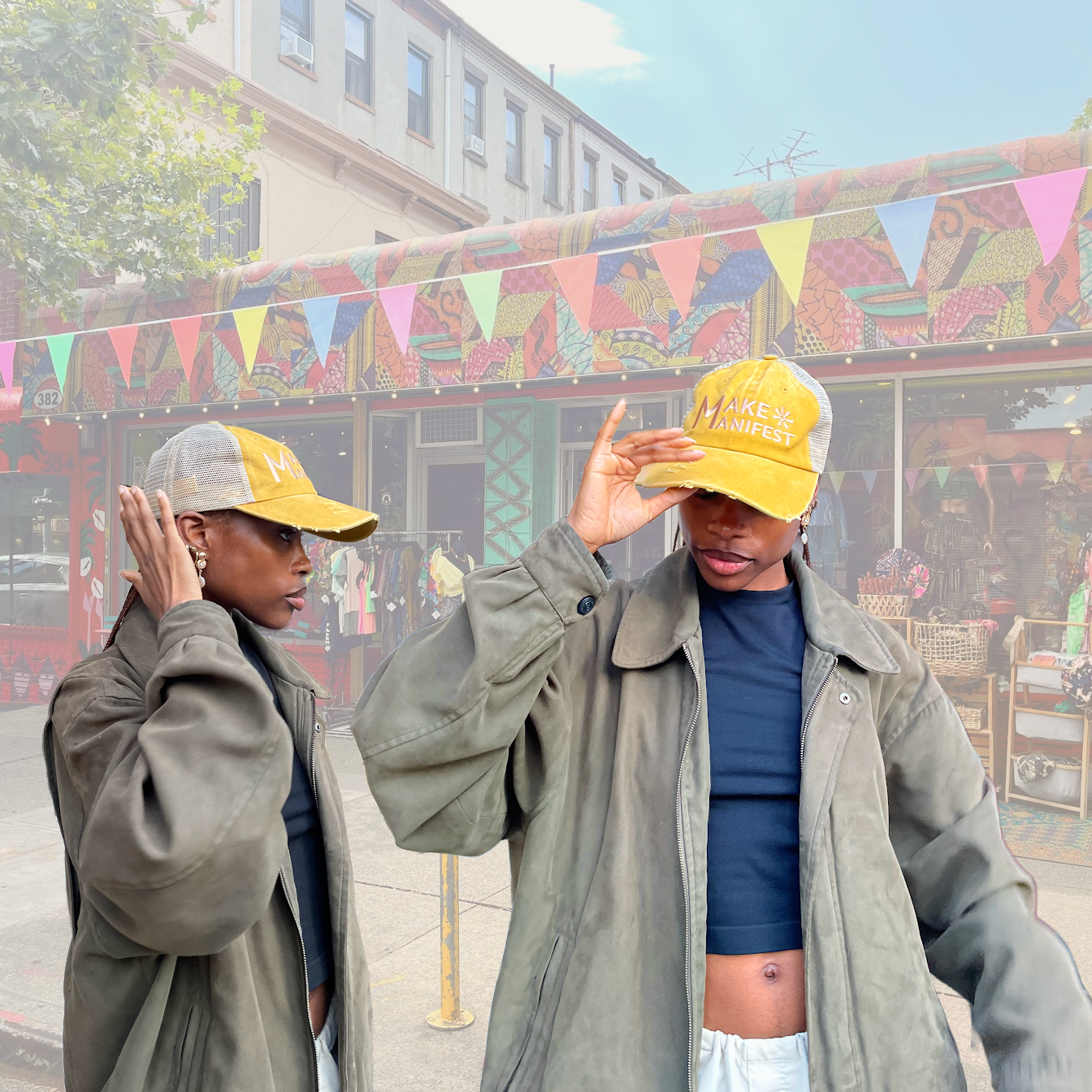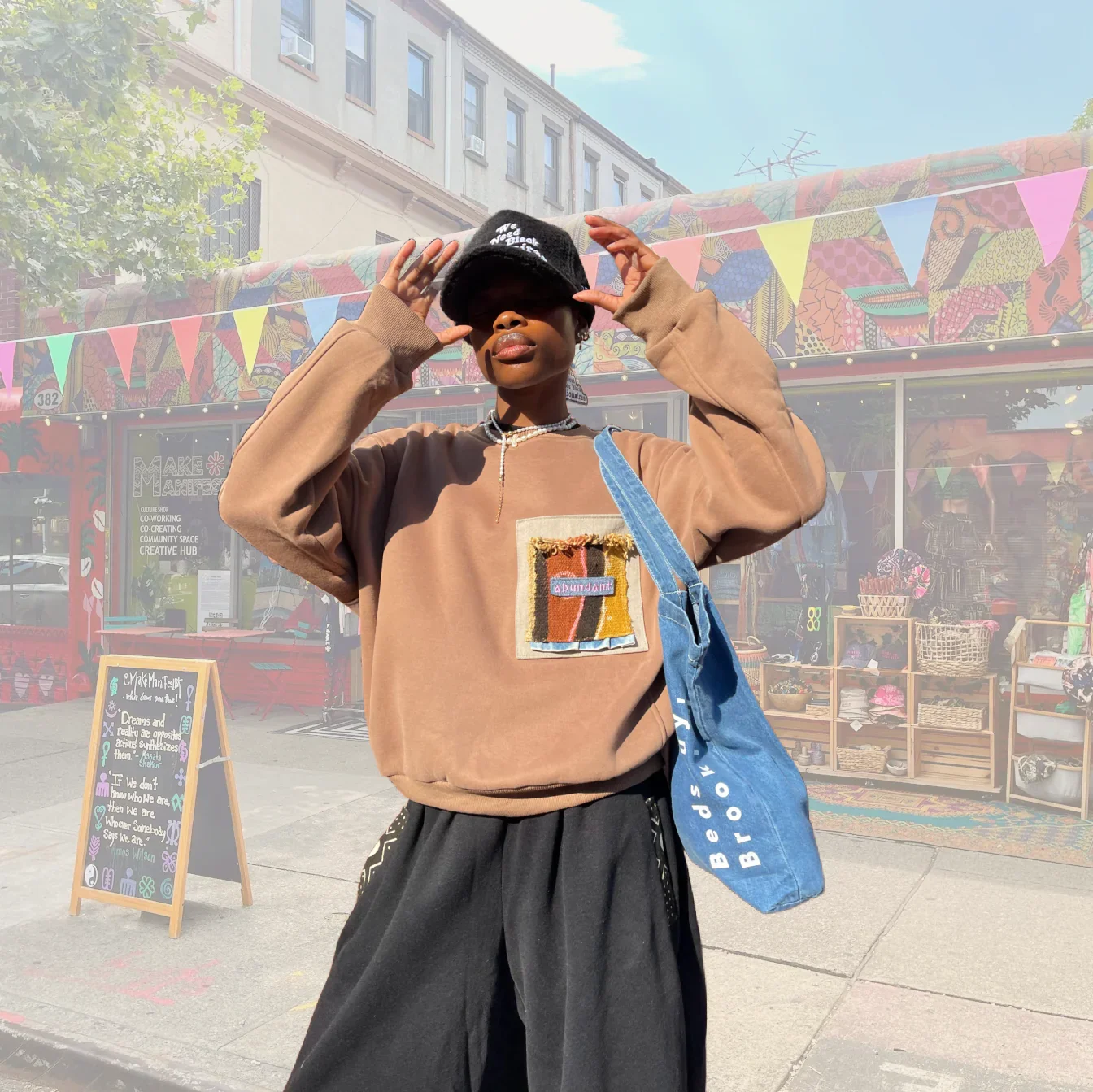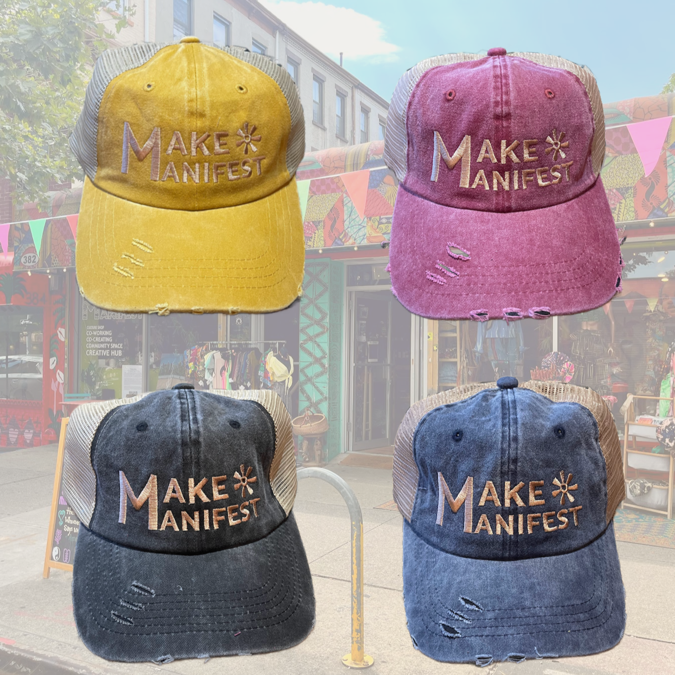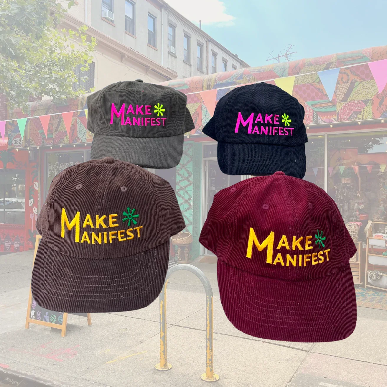 Categories: All Garments Accessories Essentials All / Acid Wash Bandanas $10.00 Evil Eye Beanies $27.00 Make Manifest Corduroy Cap $48.00 22 Cowrie Plush Bucket $99.00 Asé Bucket $75.00 Bedstuy Brooklyn Cap $40.00 Classic MMBK Denim Tote $29.00 Make Manifest Trucker $45.00 Everything works Out Denim Bucket $48.00 Make Manifest Pins $3.00 Ase Denim Cap $60.00